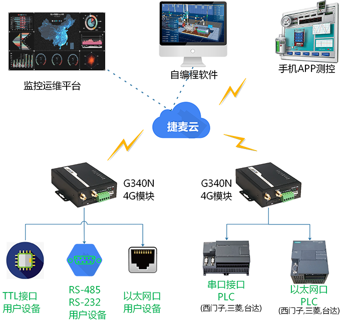 RS232/485串口/RJ45网口与4G透明传输,可与电脑、手机APP或云服务器等直接通信,支持MODBUS RTU与TCP协议转换。