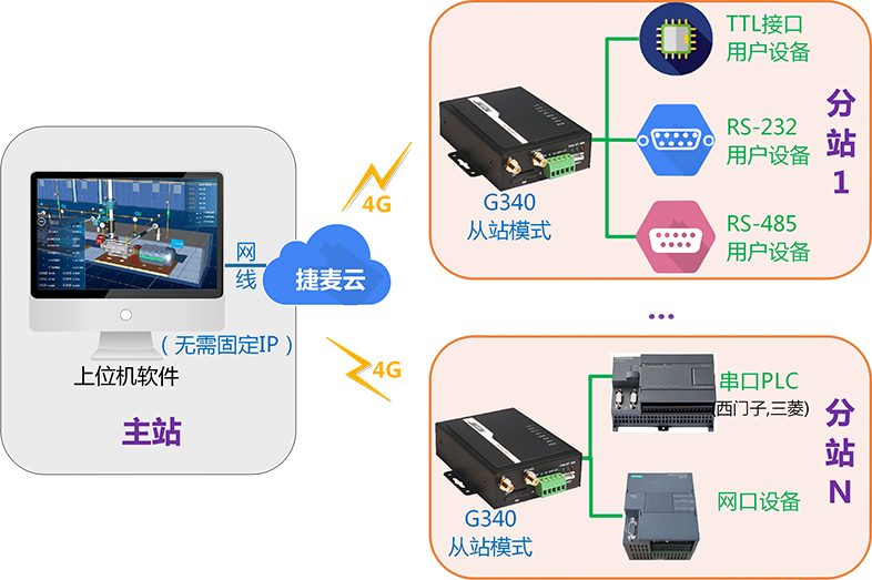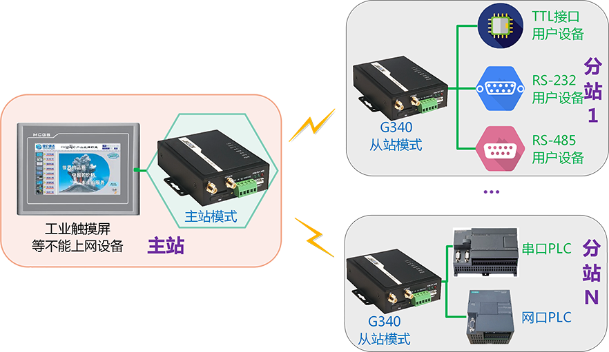 常用工作模式如果您的主站设备例如工控触摸屏、工控机或者计算机不能上网,那么需要一个工作在主站模式DTU设备,工作在主站模式的DTU,支持与多个分站 DTU 通信(最多 65535 个)