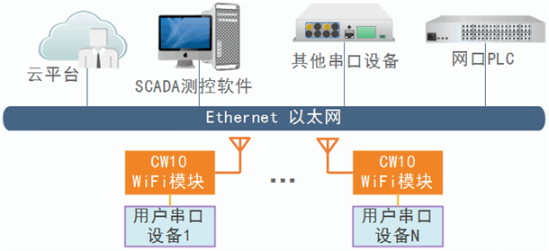 应用场景 CW10“WiFi模块”除支持无线WiFi与串口数据完全透传的串口服务器外,还支持MODBUS/RTU转MODBUS/TCP协议的MODBUS网关功能,可以非常容易地将用户串口设备接入网络HMI/SCADA等软件平台或硬件。